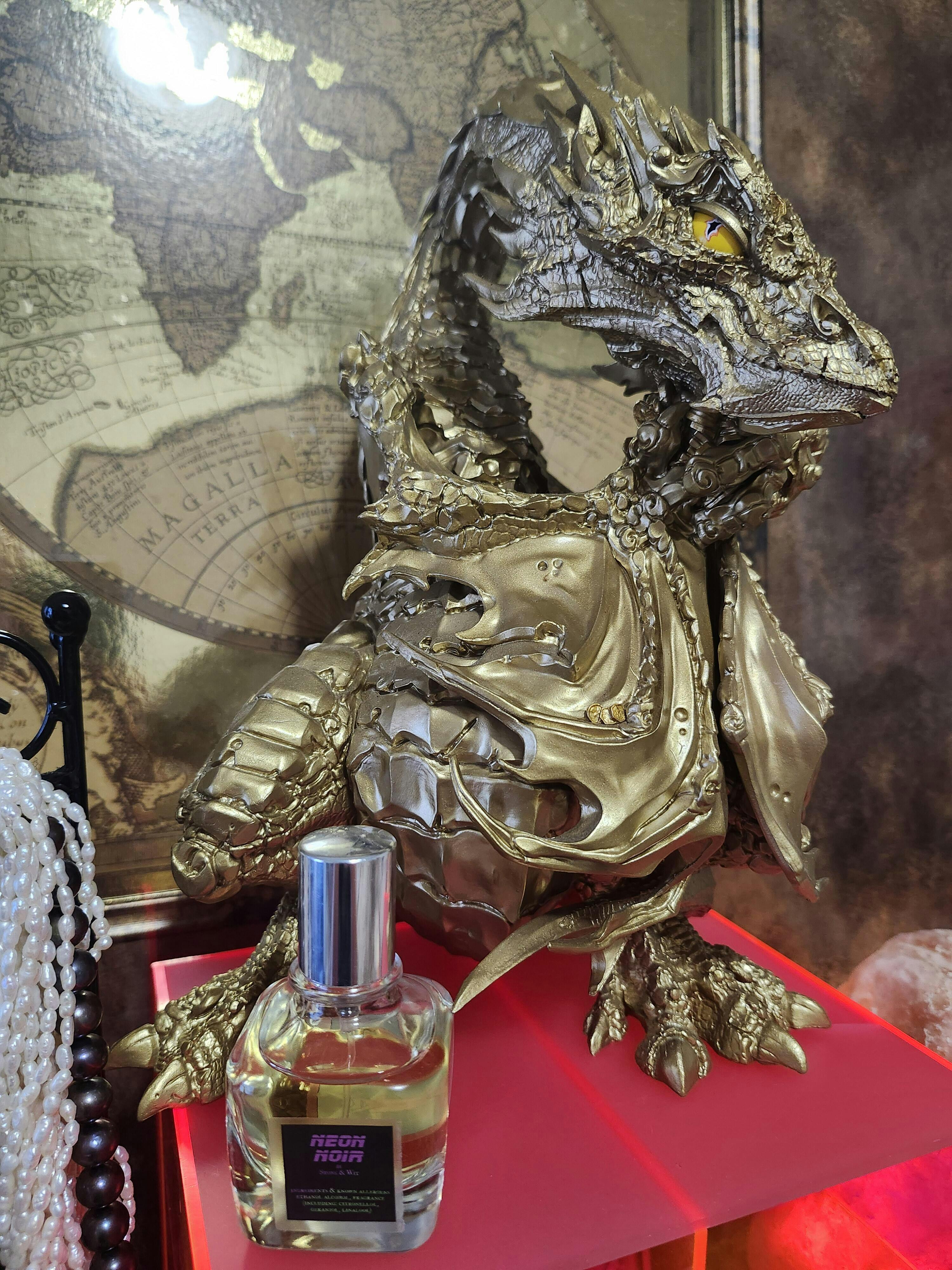 Inspired by Gunship (a long-time favorite band of mine) and the retrowave/cyberpunk sci-fi genre, I really had a lot of fun working on this one. I wanted something that mirrored the neon-lit moodiness of the cityscape of Blade Runner and the songwriting of Gunship. The cannabis leaf accord was central to the overall theme of this perfume, but I felt I had to abstract it a little. I had made a handful of accords and purchased several natural extracts that smelled like the dried buds, but they didn’t sit right with what I wanted. I wanted brightness with the underlying depth, like synth and deep humming bass. The accord I made is the green earthiness of the living plant. I backed it with plum to give it the deep undertone I wanted, while the vetiver and cetalox help give it strength and fullness.